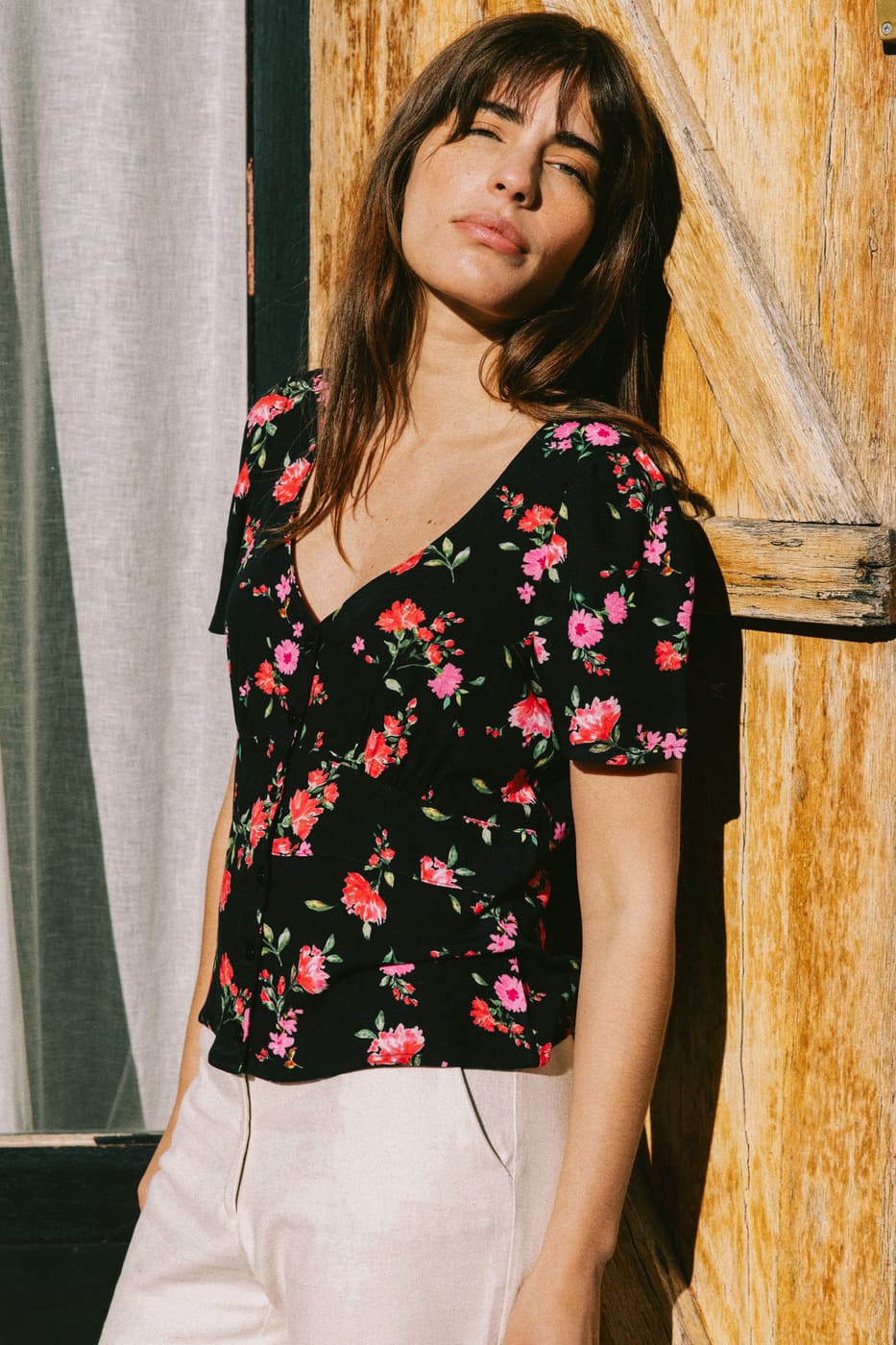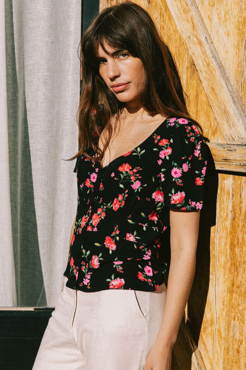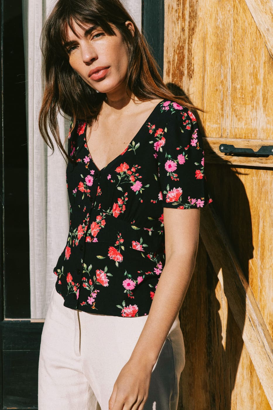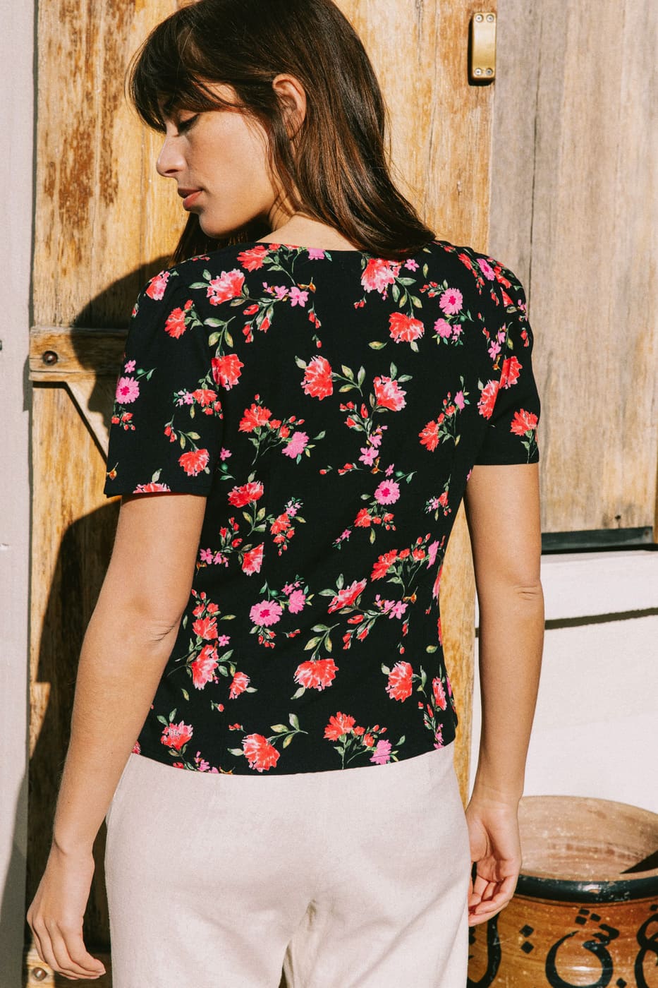 – Short-sleeved blouse with a square neckline, gathered shoulders, and a band under the bust for a cinched waist
