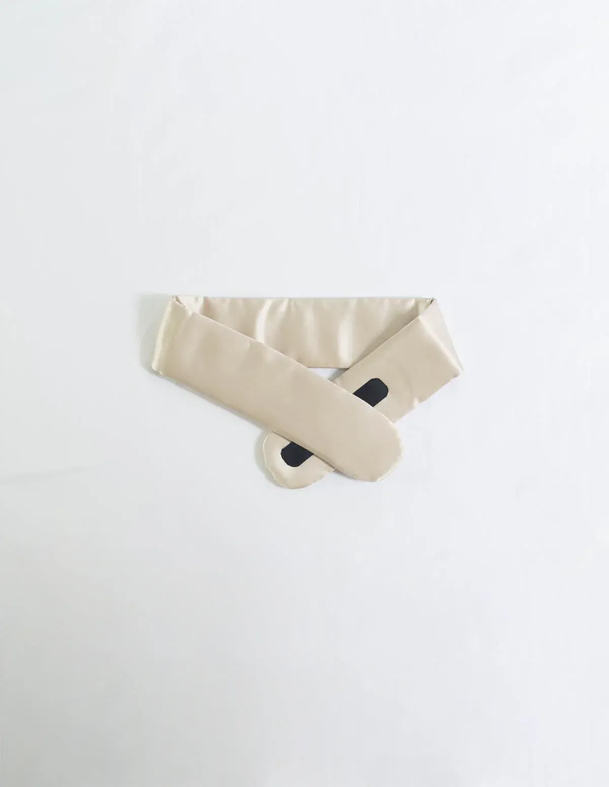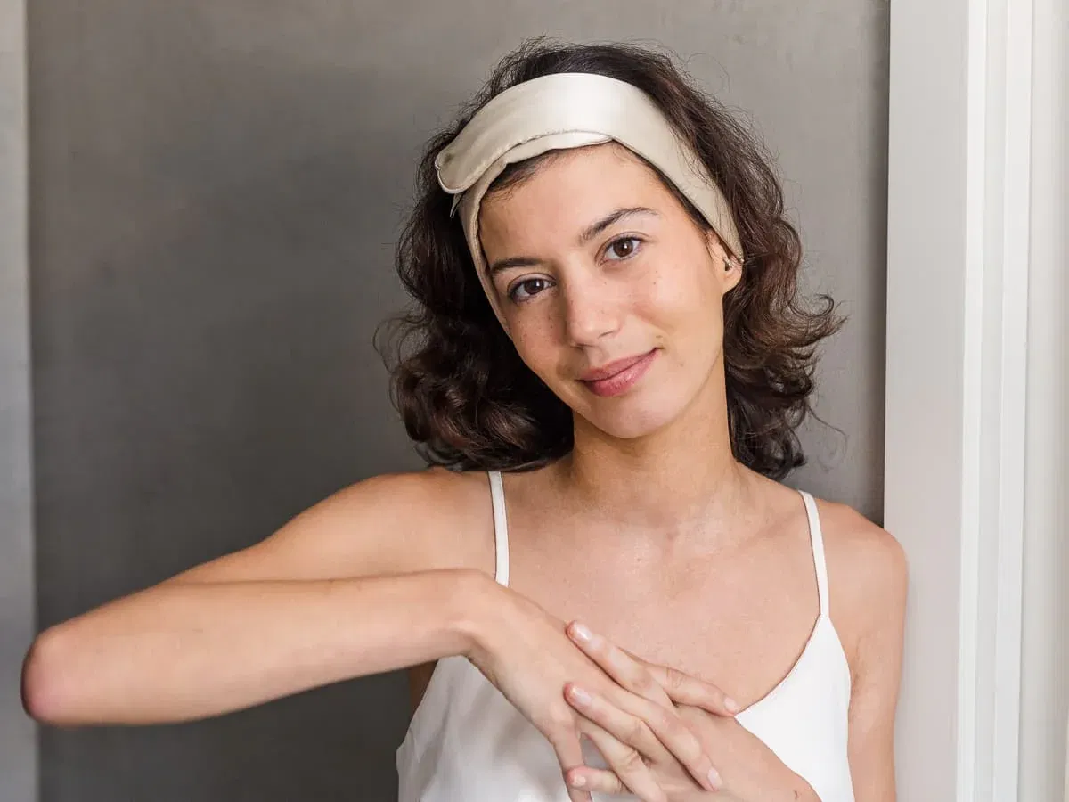Deeya Uni Organic Silk Make-Up Headband keeps hair out of face while applying makeup.