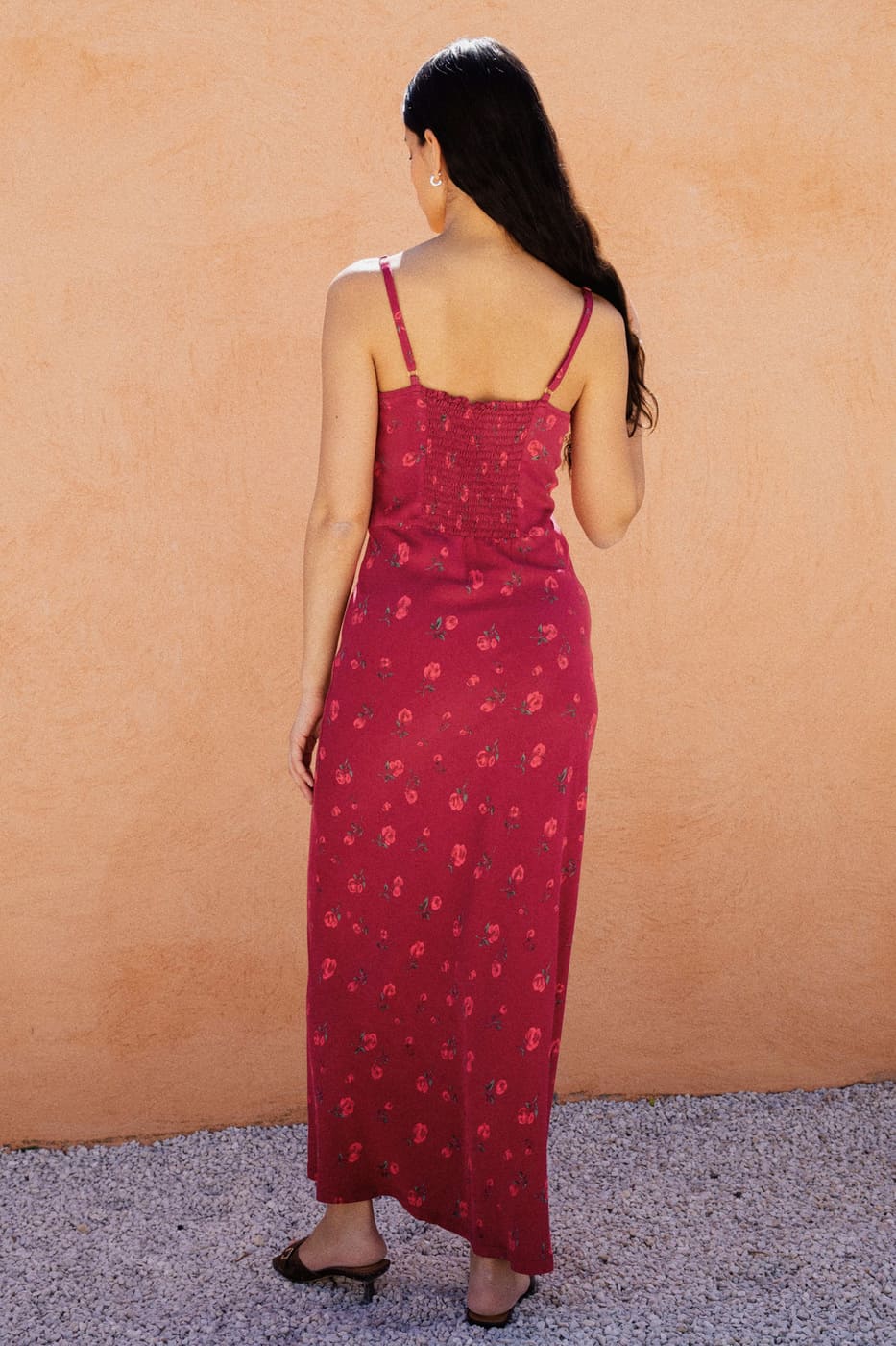 – Long printed dress with thin straps, featuring a V-neckline, a smocked back, and a fitted silhouette.