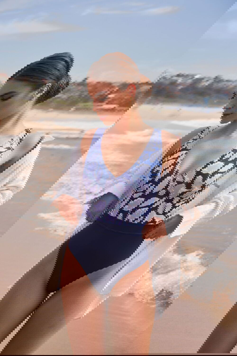 It features a flattering V-neckline, a beautifully rounded open back, and a classic leg cut that’s easy to wear. Made from premium Italian recycled fabric, it’s ultra-soft, stretchy, UV-protective, and built to keep its shape swim after swim.