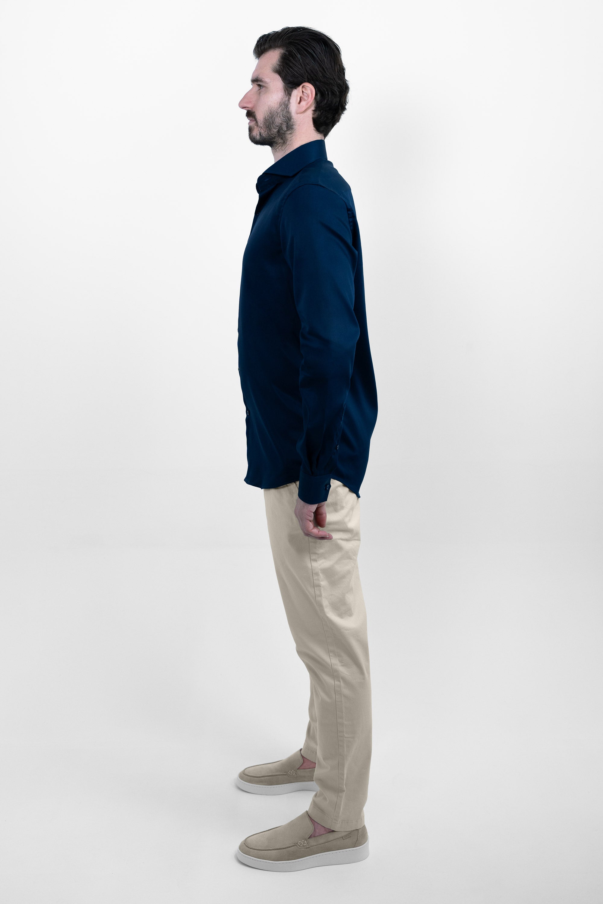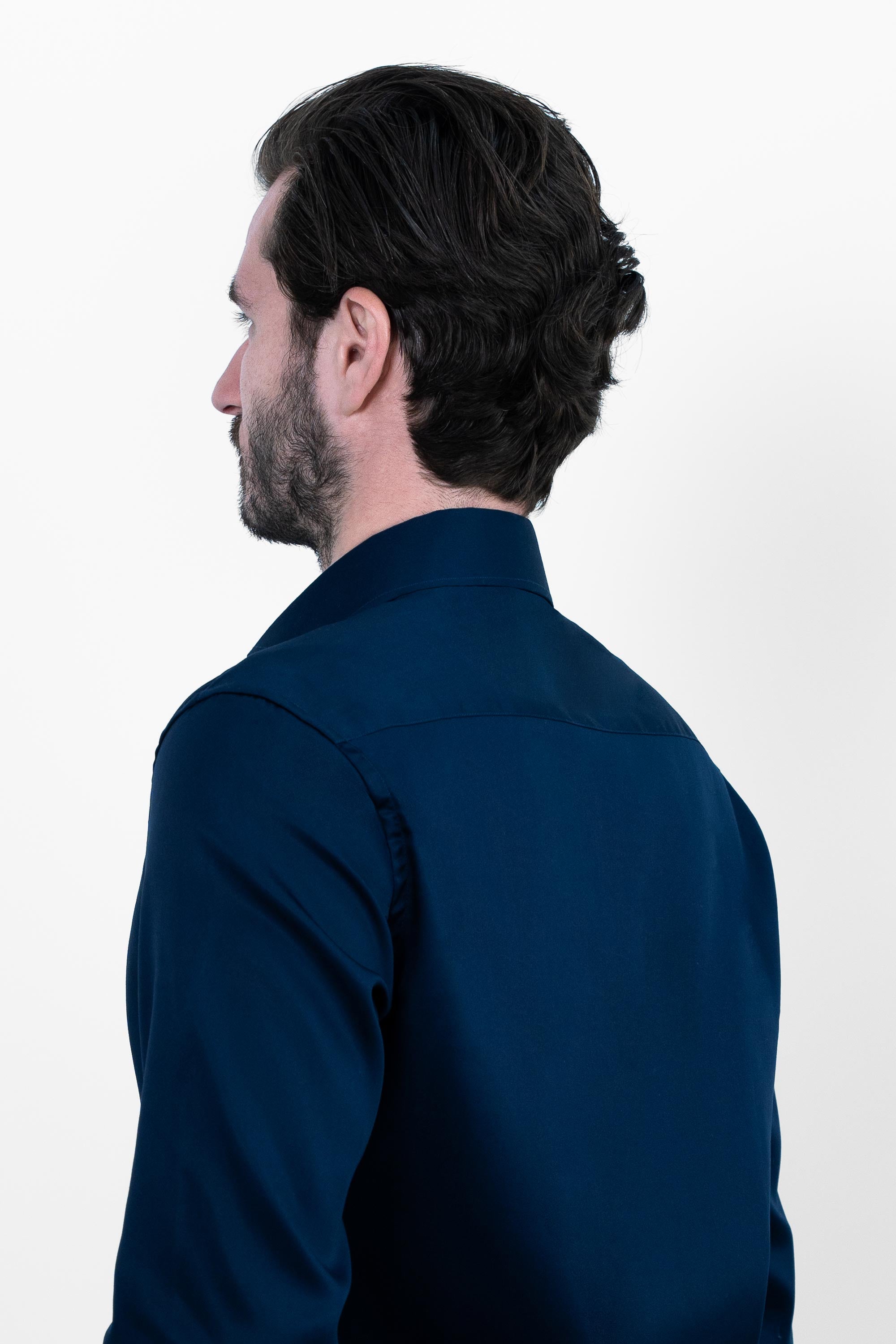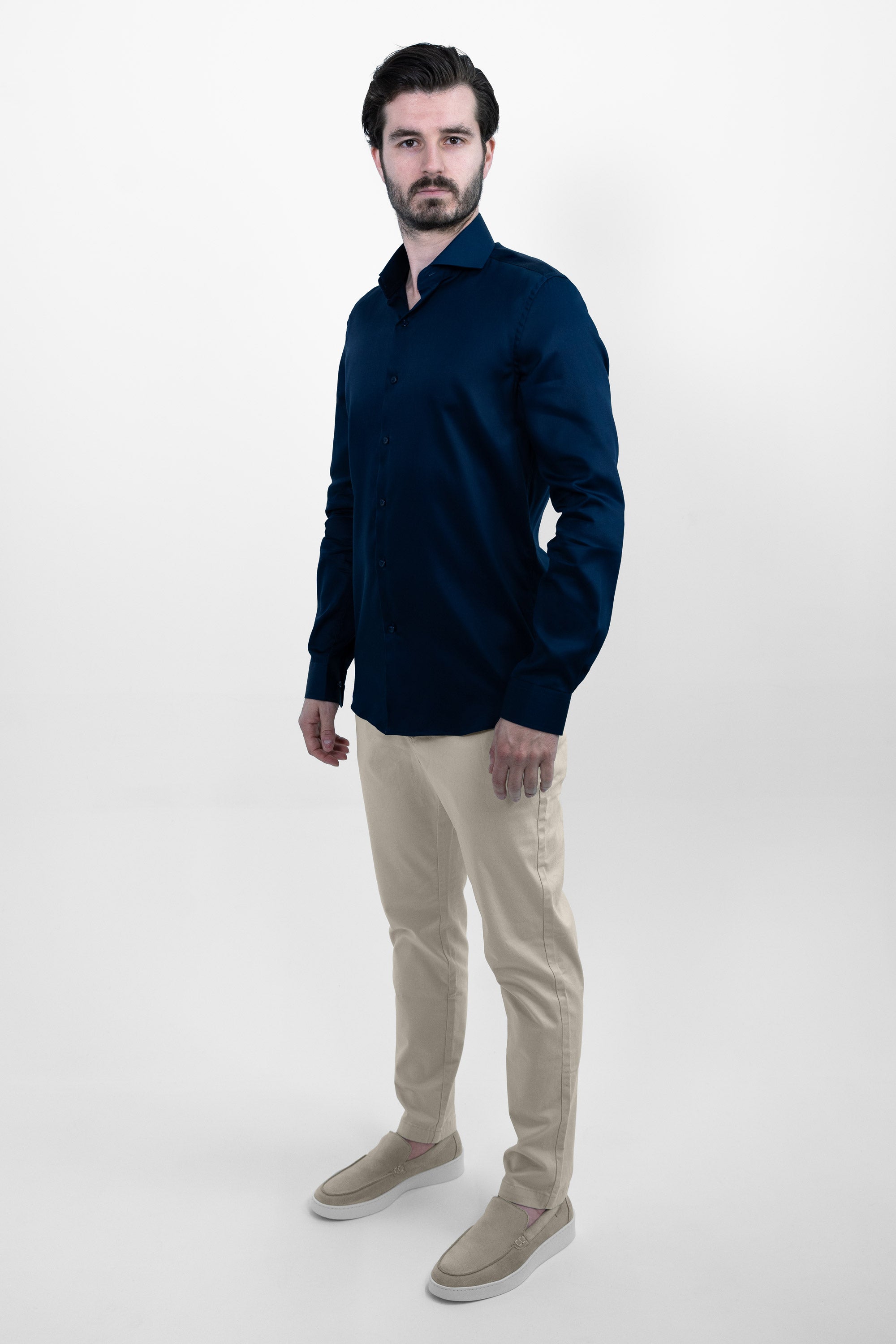 A beautiful Non Iron Shirt Navy – Cotton Satin made of 100% satin woven cotton. This navy shirt is well-ventilating and moisture-absorbing due to the natural cotton satin. With our slim fit, the shirt falls nicely tailored to any size. Suitable for both business and formal wear and finished with a tight cutaway collar.