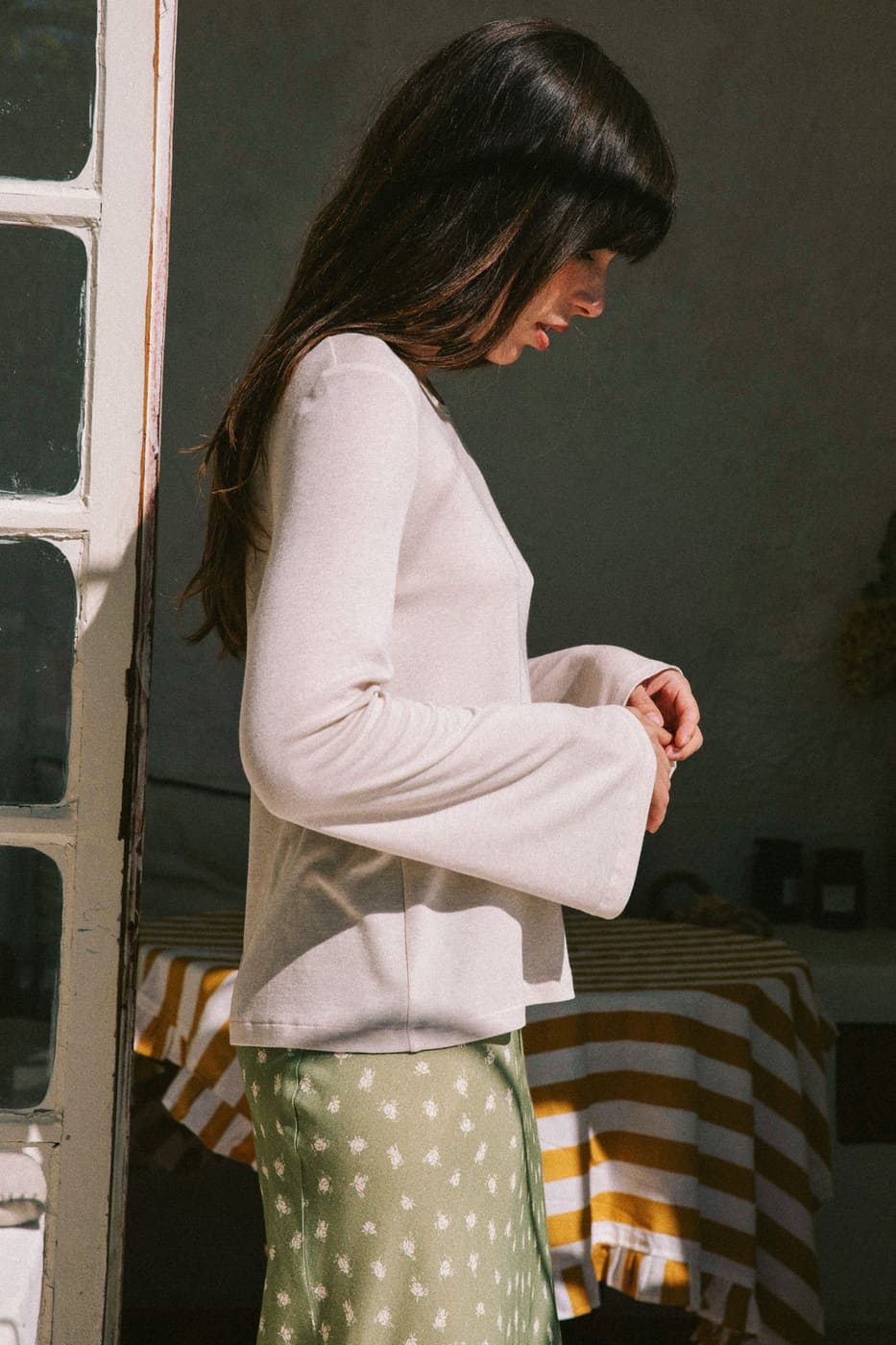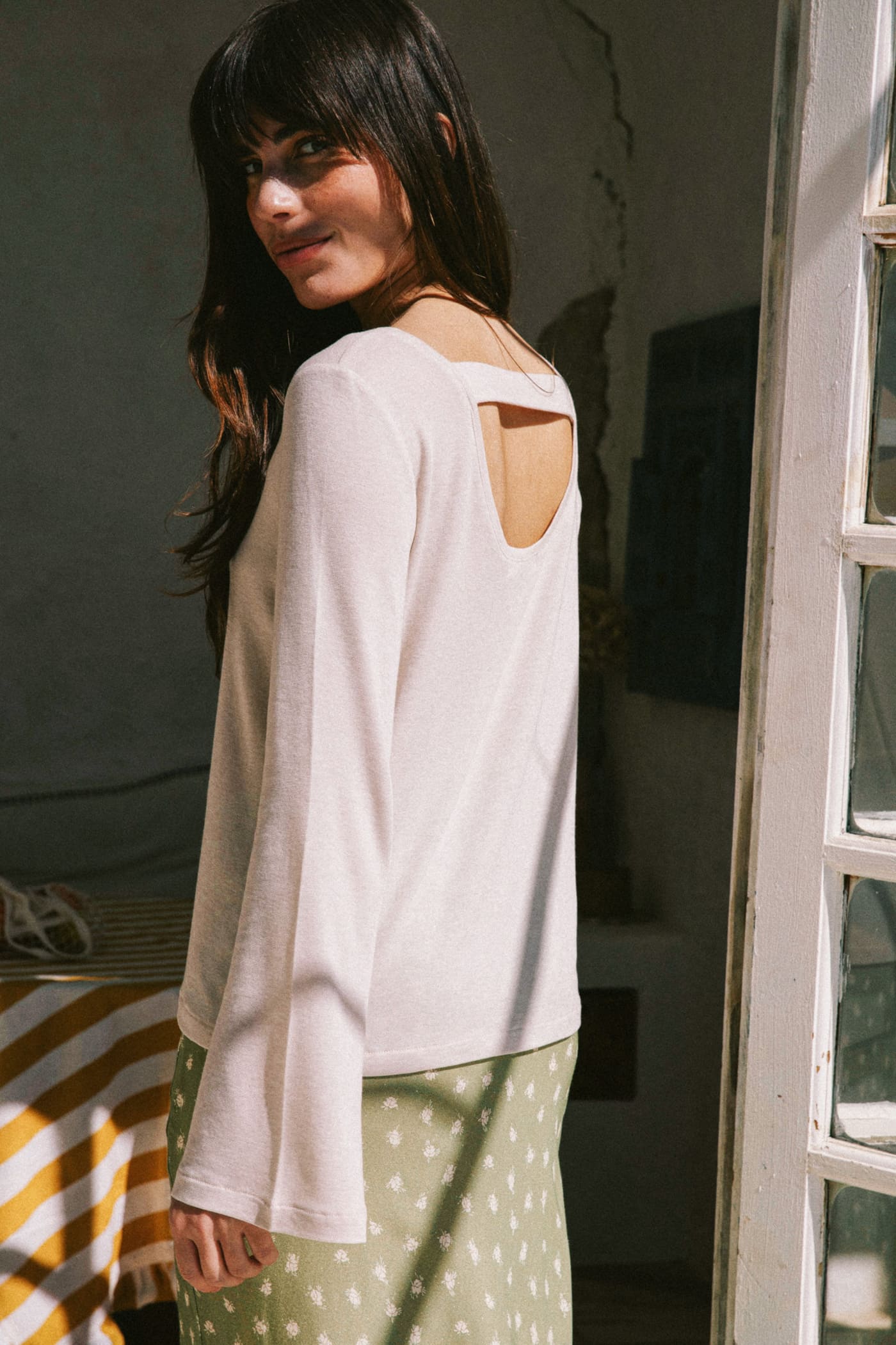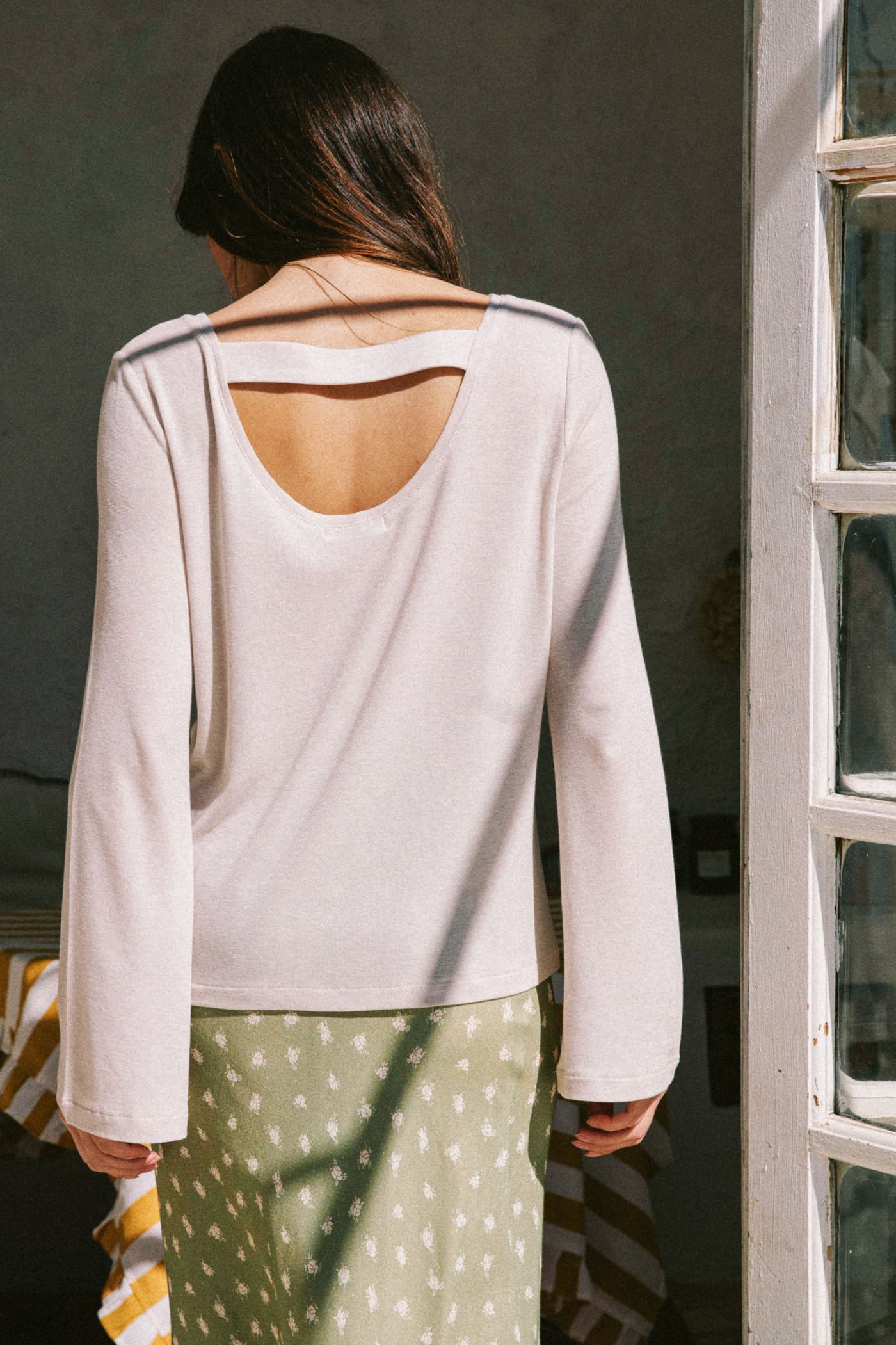 – Fluid long-sleeved top with flared sleeves, a wide neckline, and an open back detail