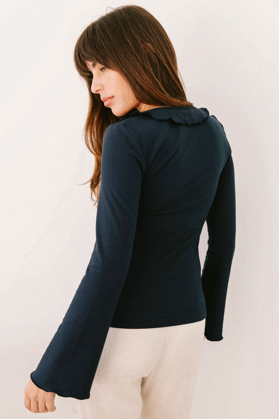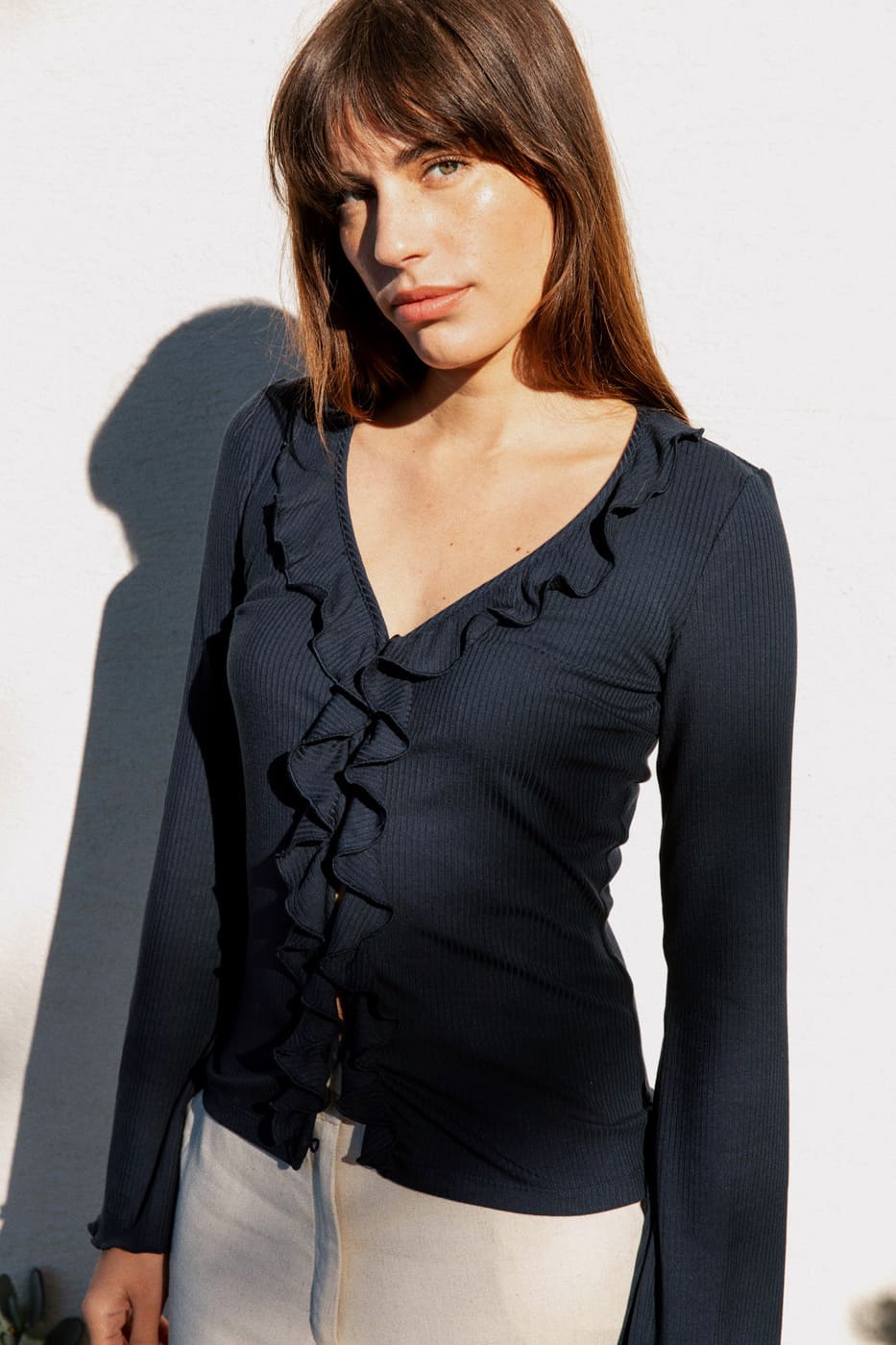 – Ribbed top with long flared sleeves, V-neck, ruffles on the front, and button placket